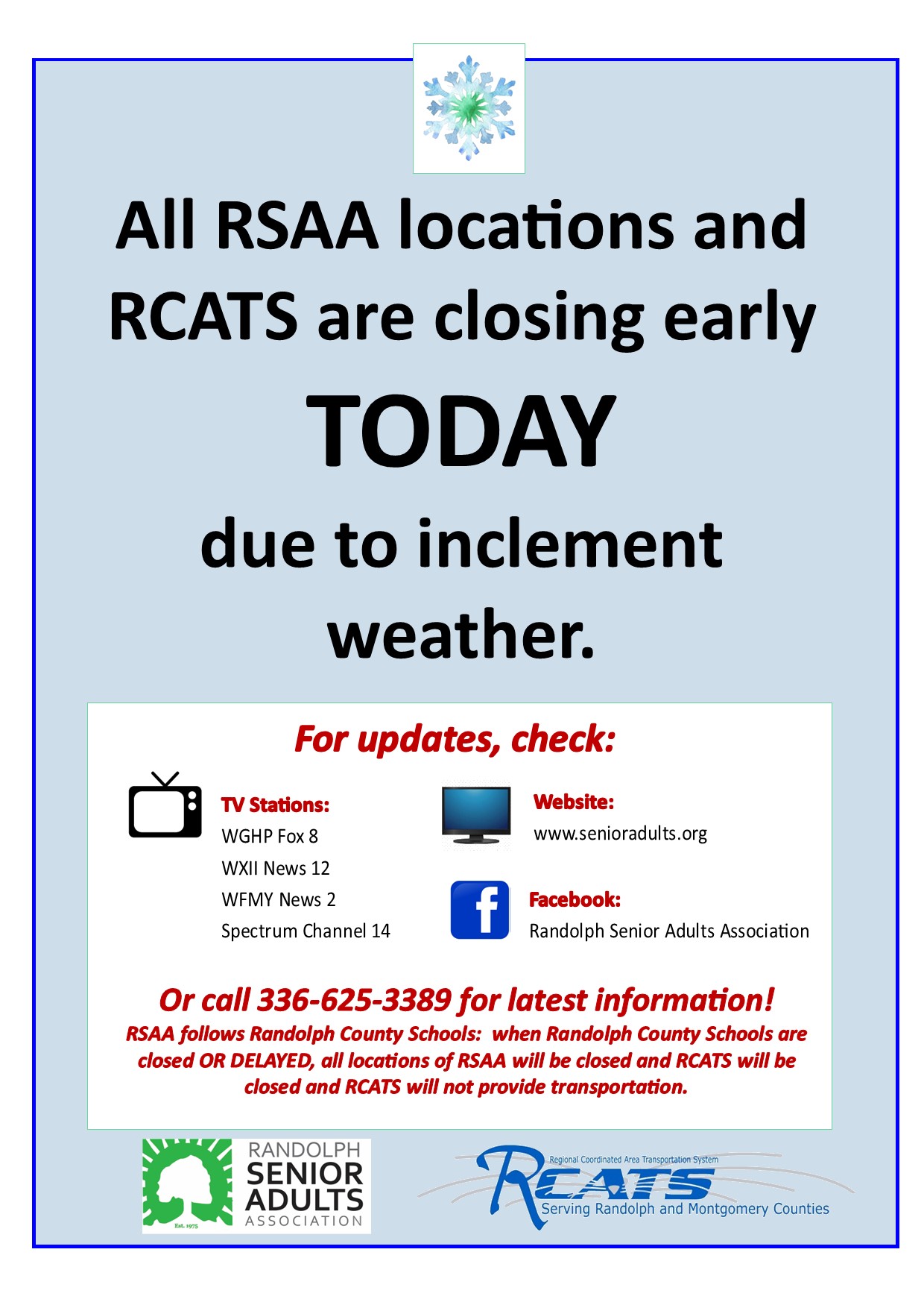 The Randolph Senior Adults Association and RCATS (Randolph County) follows the Randolph County Schools Inclement Weather Plan.