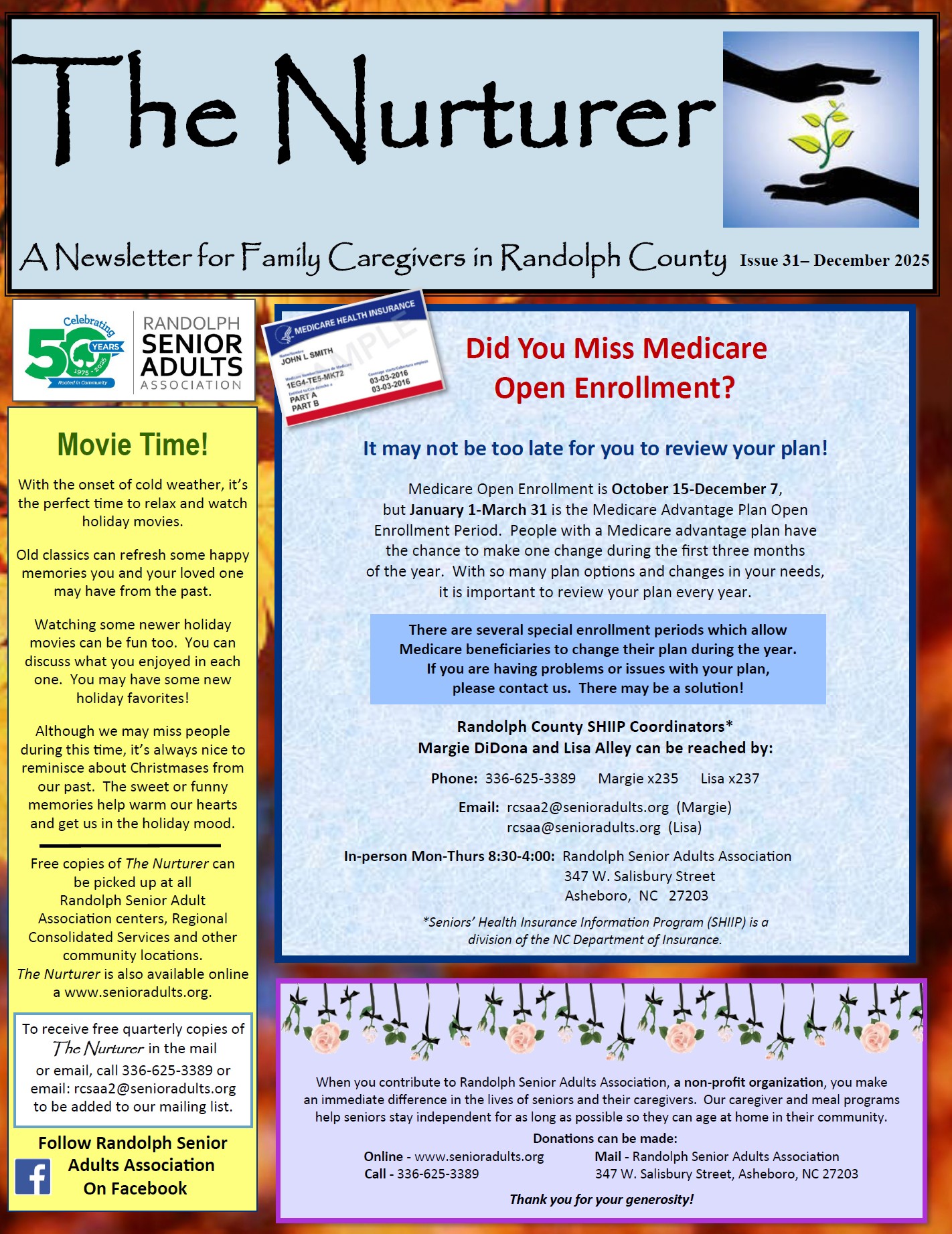Issue #31 (published December 2025). Click here to read our latest issue of The Nurturer, a newsletter for family caregivers in Randolph County. Free copies of The Nurturer can be picked up at all Randolph Senior Adult Association locations, Randolph Health, Regional Consolidated Services and other community sites. To receive free quarterly copies of The Nurturer in the mail or via email, call 336-625-3389 or email: rcsaa2@senioradults.org to add your name to our mailing list.