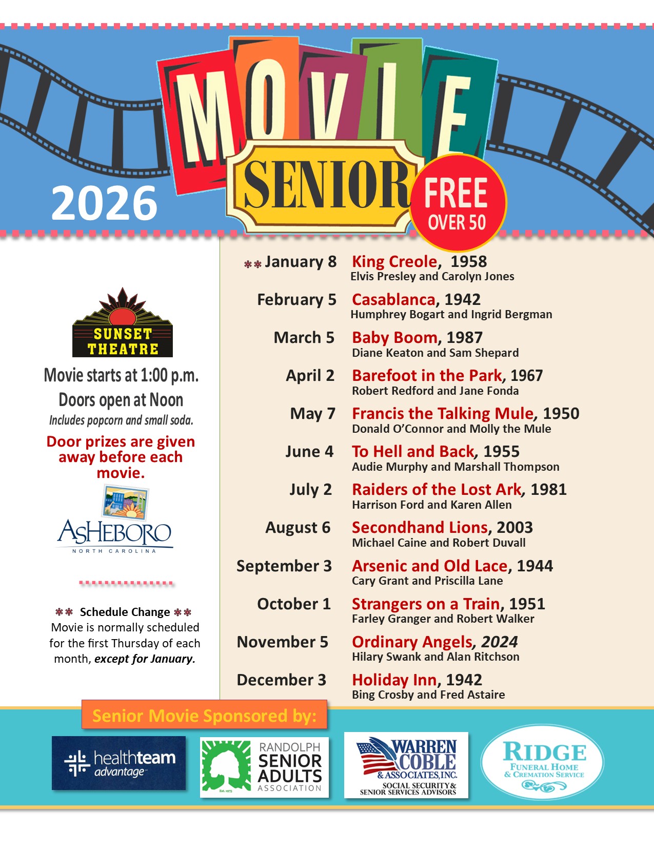 Grab a friend or two and join us each month at the Historic Sunset Theatre in downtown Asheboro for the Senior Movie! Ages 50+ receive FREE admission to the movie, as well as a FREE popcorn, a FREE small drink, and entry into door prize drawings.