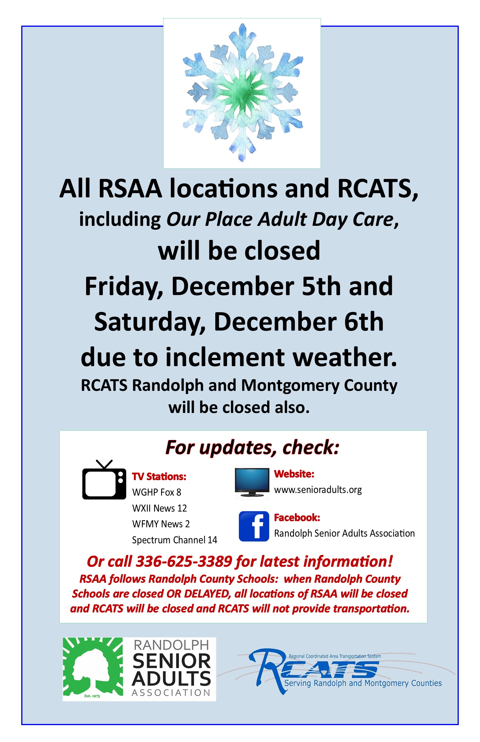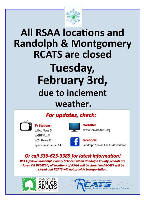 The Randolph Senior Adults Association and RCATS (Randolph County) follows the Randolph County Schools Inclement Weather Plan.