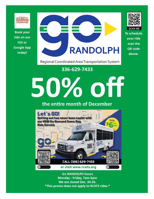 If you need transportation assistance, please call the RCATS office at 336-629-7433 (Randolph County) or