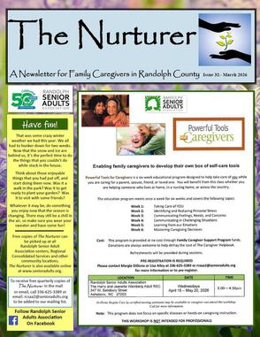 Issue #32 (published March 2026). Click here to read our latest issue of The Nurturer, a newsletter for family caregivers in Randolph County. Free copies of The Nurturer can be picked up at all Randolph Senior Adult Association locations, Randolph Health, Regional Consolidated Services and other community sites. To receive free quarterly copies of The Nurturer in the mail or via email, call 336-625-3389 or email: rcsaa2@senioradults.org to add your name to our mailing list.